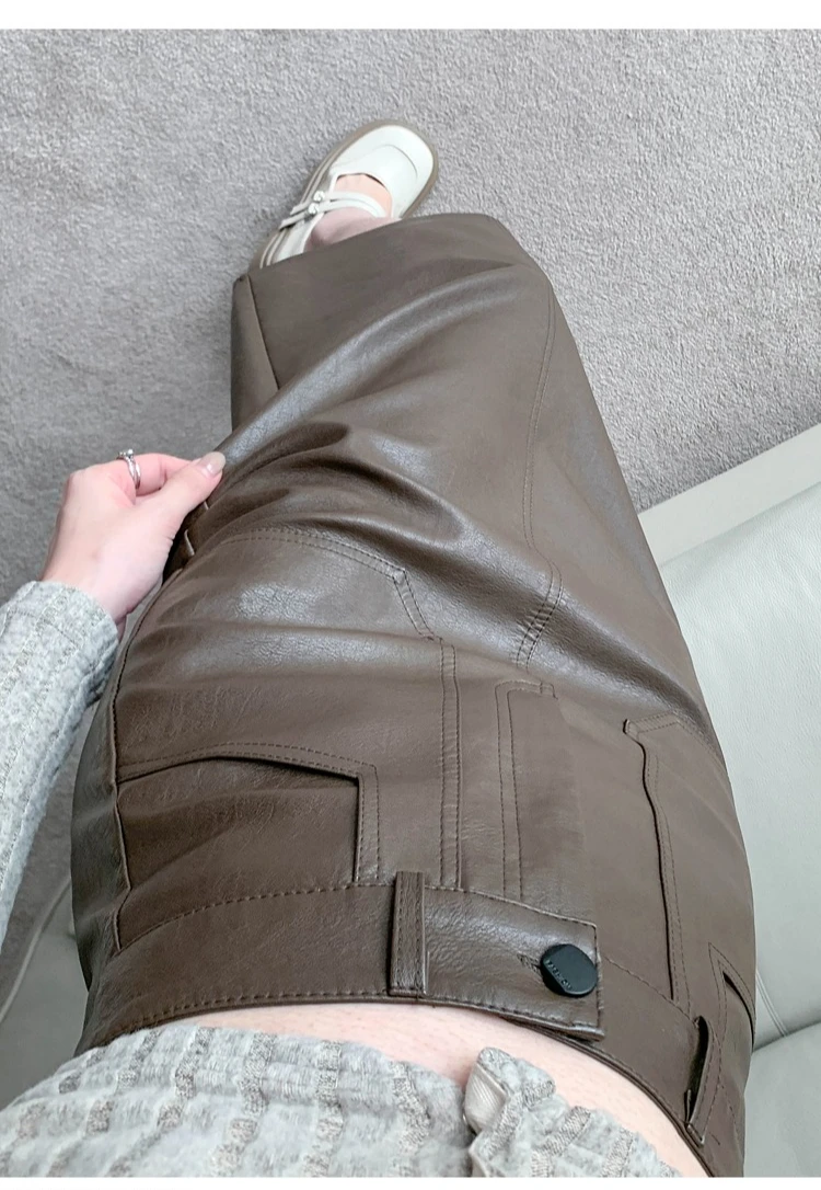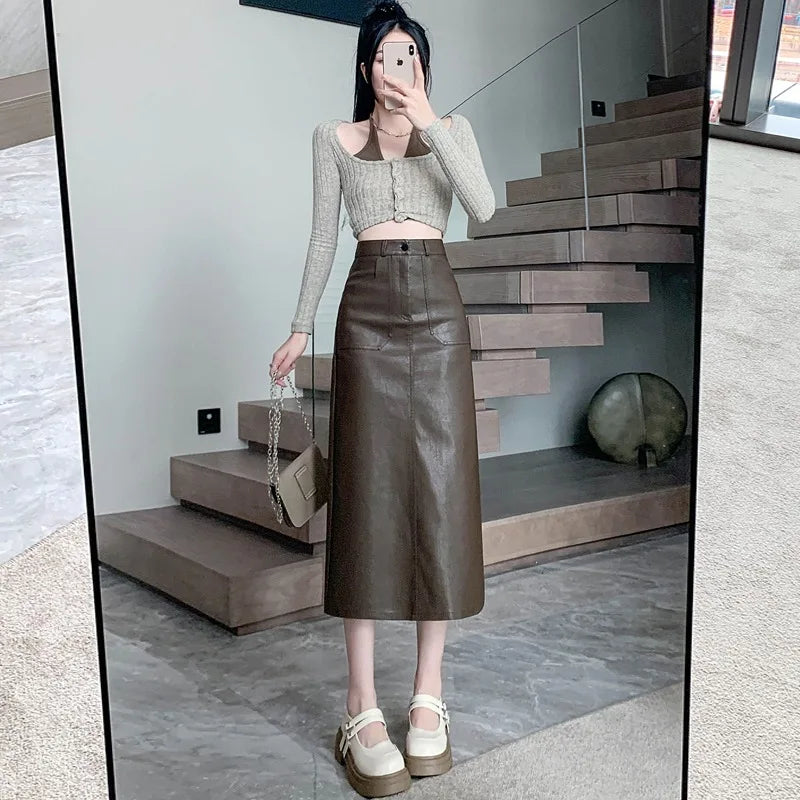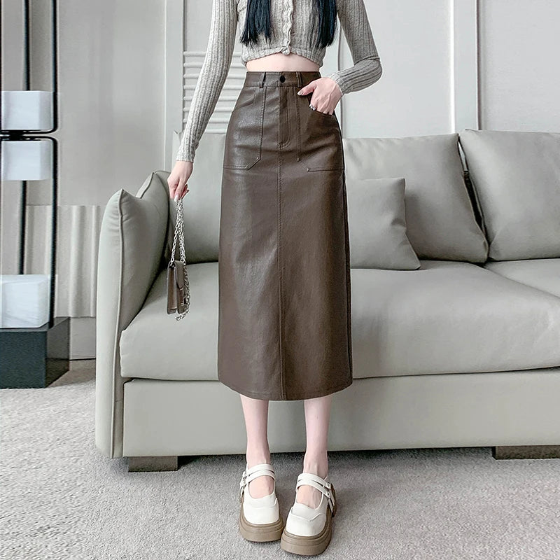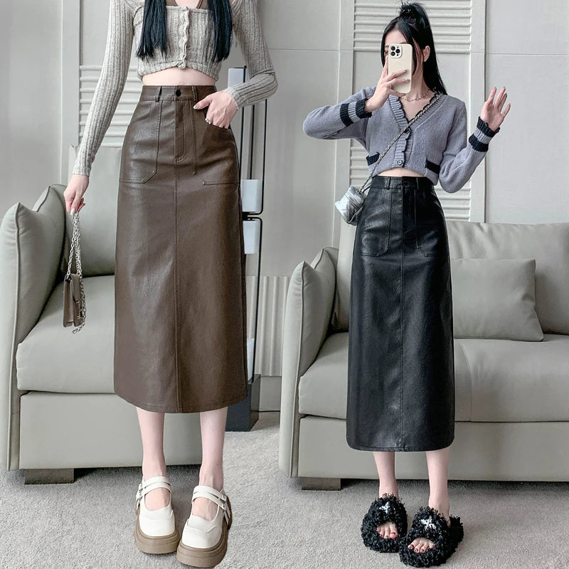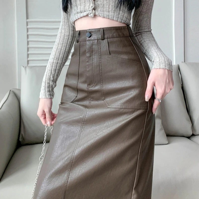 Autumn Winter High Waist Vintage Washed PU Leather Women's Sheath Wrap Skirts Pocket 2025 Back Split Office A-line Skirts Female