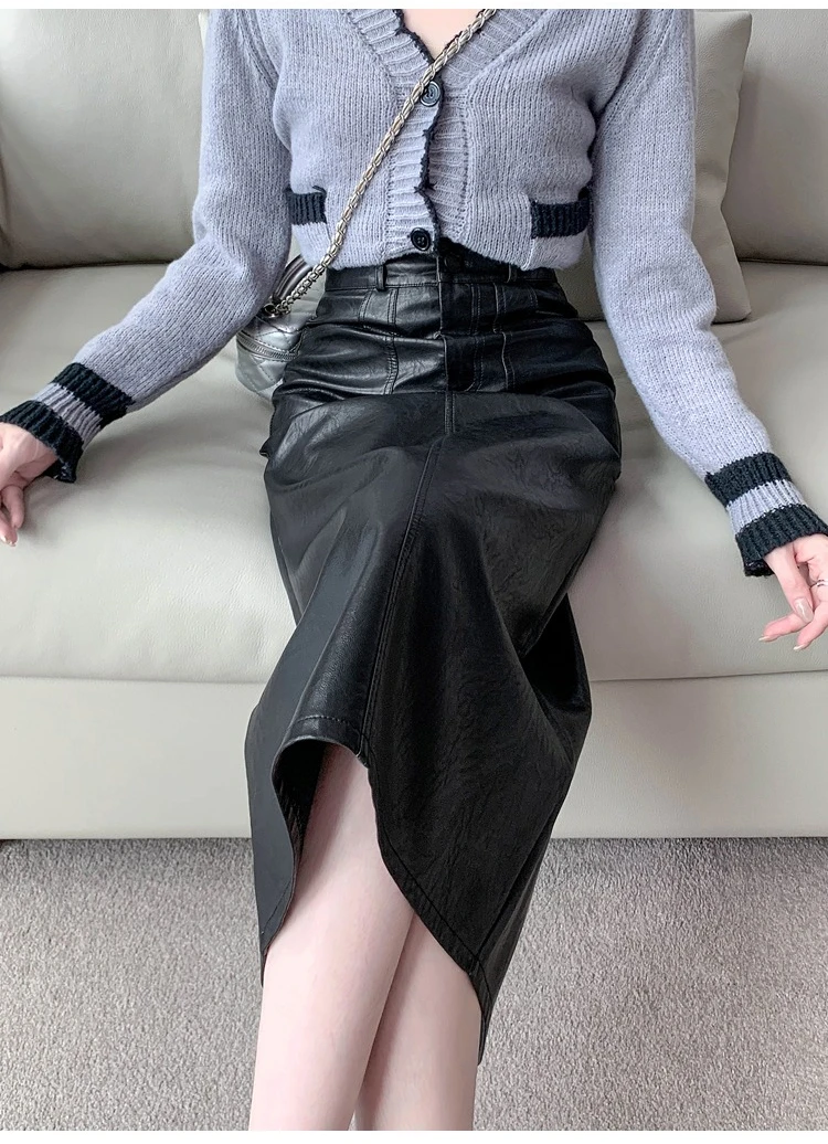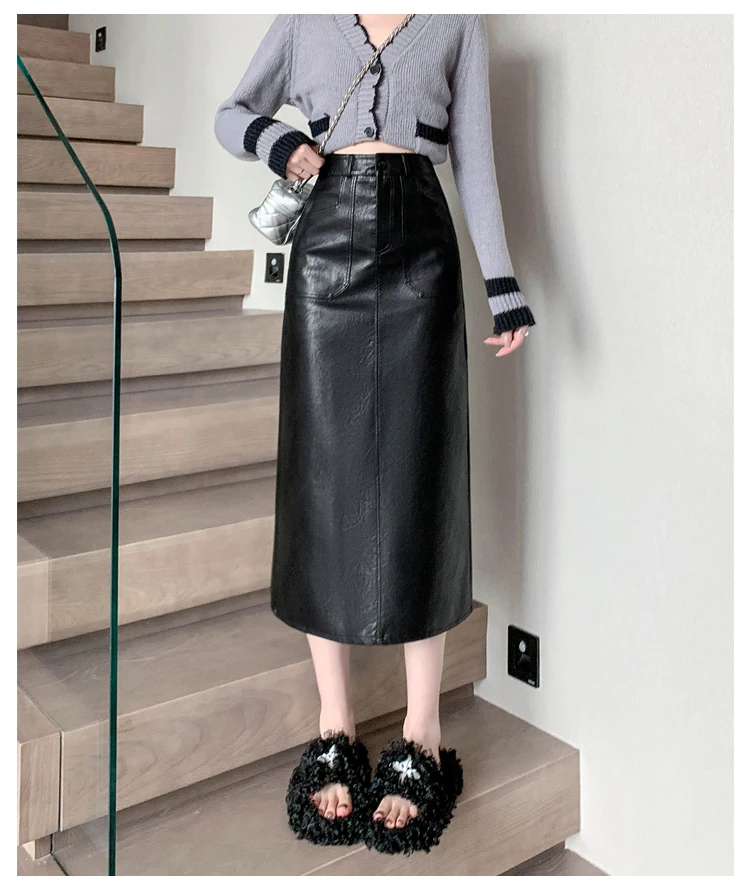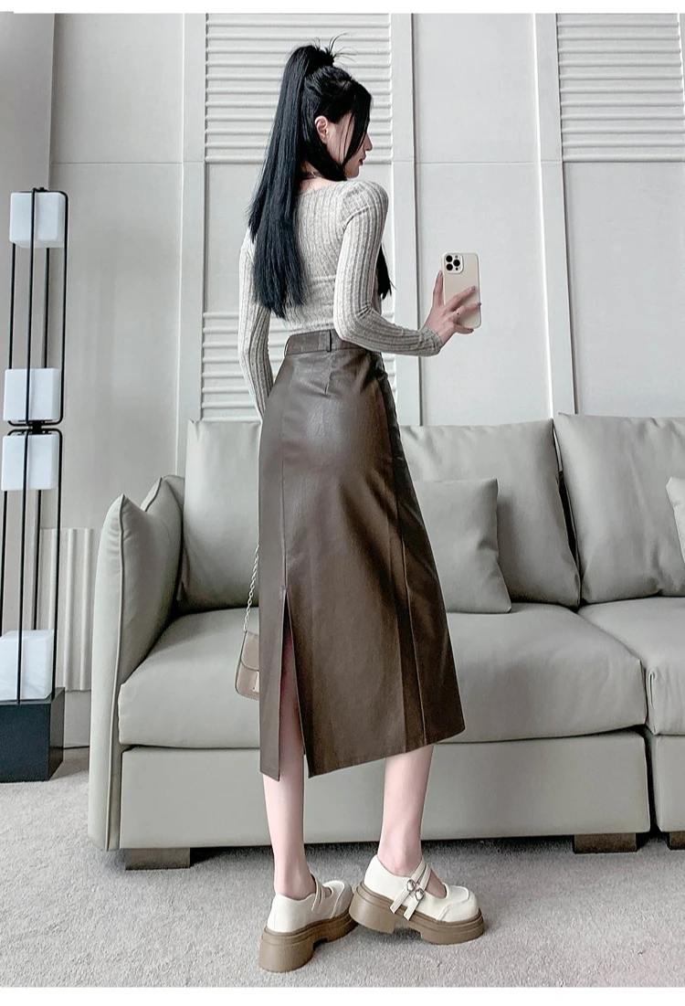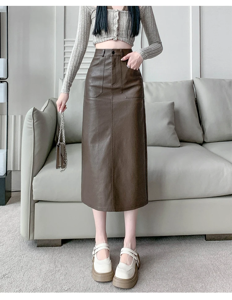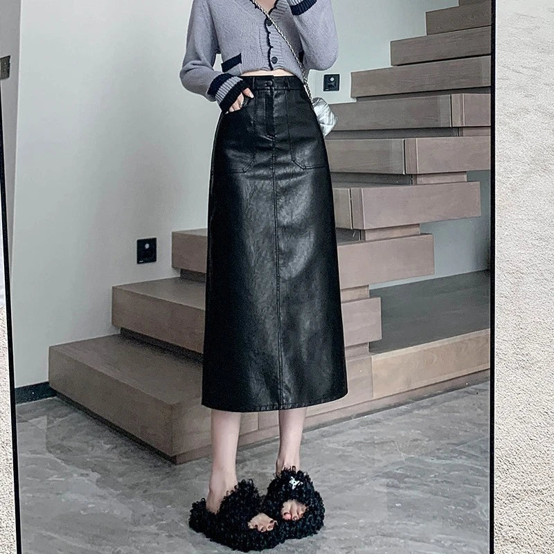 Autumn Winter High Waist Vintage Washed PU Leather Women's Sheath Wrap Skirts Pocket 2025 Back Split Office A-line Skirts Female
